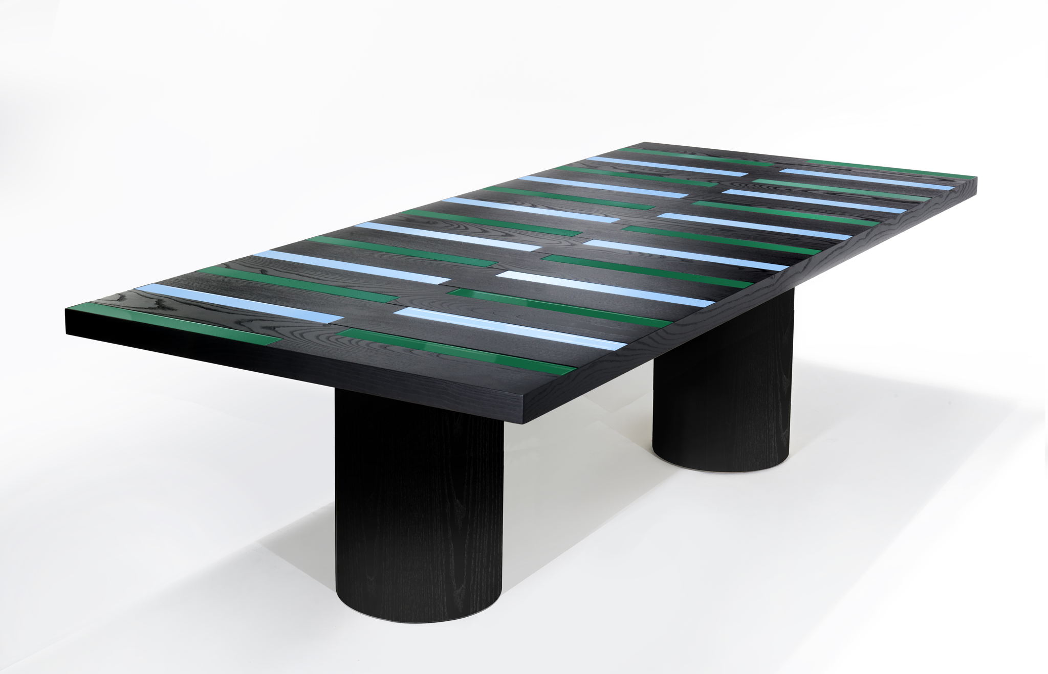The tabletop is available in two versions: black, with refined back-painted glass in mint and sky tones, or amaranth, with ivory and coral glass inserts that bring vibrancy and dynamism to the design.
