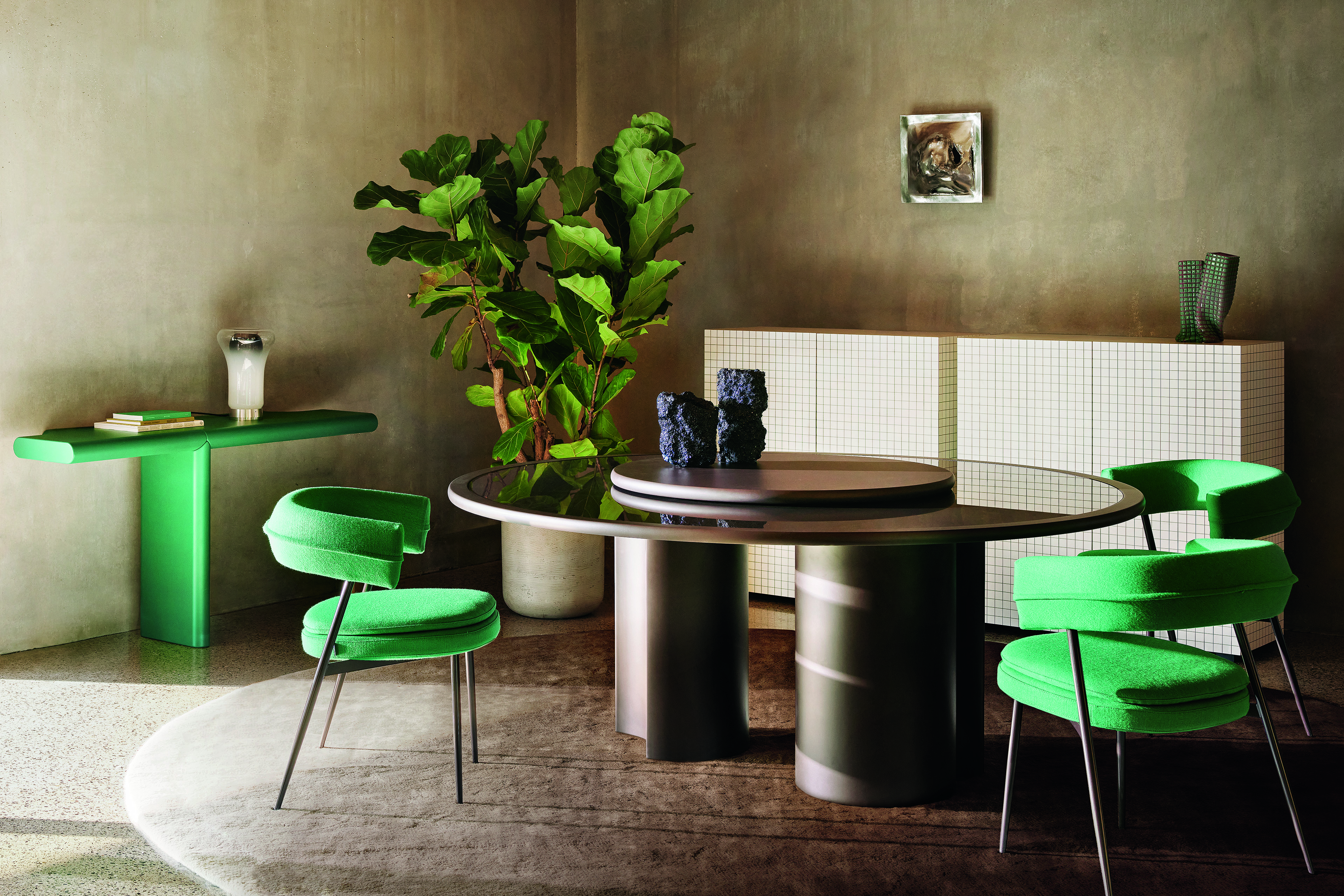 In addition to its original version, with a stainless steel frame and round glass top (available in diameters of 120 cm, 130 cm, 140 cm, and 150 cm), Marcuso is now accompanied by new colourful interpretations, featuring marble or lacquered MDF tops that reinterpret the design in a contemporary key and expand its expressive potential.