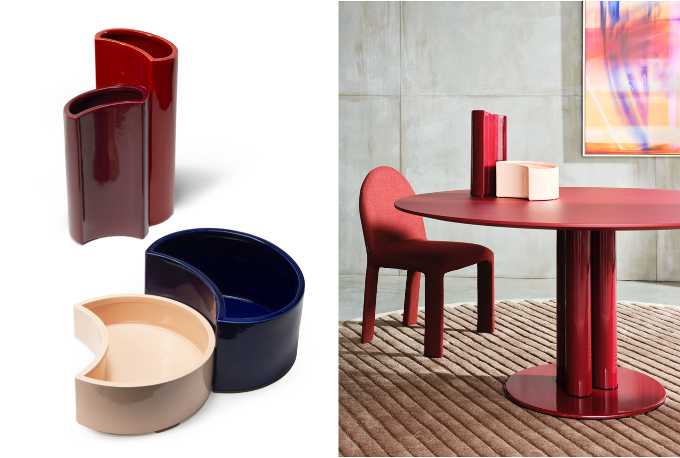Available in four sizes – two tall and narrow (16×37 cm and 16×29 cm) and two short and wide (26×15 cm and 26×9 cm) – they are crafted from glossy glazed clay in pink, dark blue, red and burgundy.